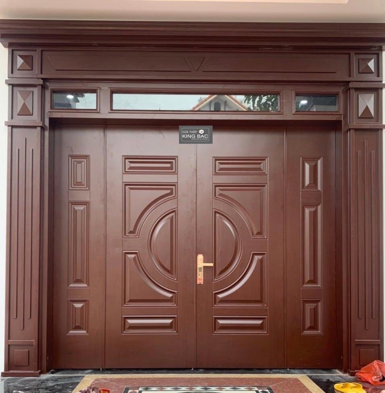 Ngoài tính năng an toàn, cửa thép chống cháy vân gỗ SaigonDoor còn được đánh giá cao về mặt thẩm mỹ. Lớp vân gỗ được xử lý kỹ lưỡng, tái hiện một cách sống động các loại gỗ quý hiếm. Với sự đa dạng về mẫu mã và màu sắc vân gỗ, sản phẩm dễ dàng phù hợp và làm tăng giá trị cho mọi không gian nội thất. Cấu hình 4 cánh không chỉ tạo nên vẻ hoành tráng, quý phái mà còn đem lại cảm giác trang trọng, đẳng cấp cho kiến trúc. SaigonDoor đã hoàn thành nhiều công trình lớn, nơi cửa thép chống cháy vân gỗ 4 cánh đóng vai trò là chi tiết kiến trúc độc đáo.